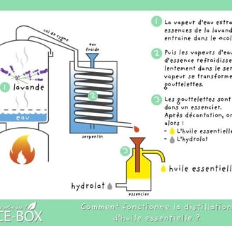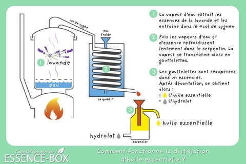 La distillation par entrainement à la vapeur d’eau : apporte une amélioration de la qualité des produits obtenus. C’est également le processus le plus employé car il est adapté à une grande variété d’espèces végétales et à une grande variété d’organes (ex. : huiles essentielles de lavande, lavandin, camomille, géranium, eucalyptus, etc.).